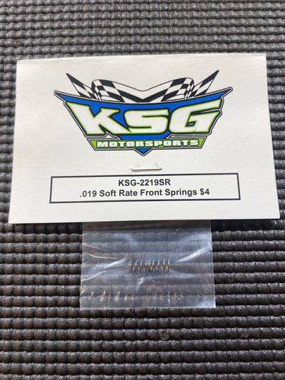 This is a pair of KSG Motorsports .019" soft rate 1/10 front springs for the front end of your Pemberton Raceworks vehicle (fits all models). Also used on 1/12 cars paired with part# PRW13300 (Lower Arm Pivot Balls - 1/12 - Turcite).