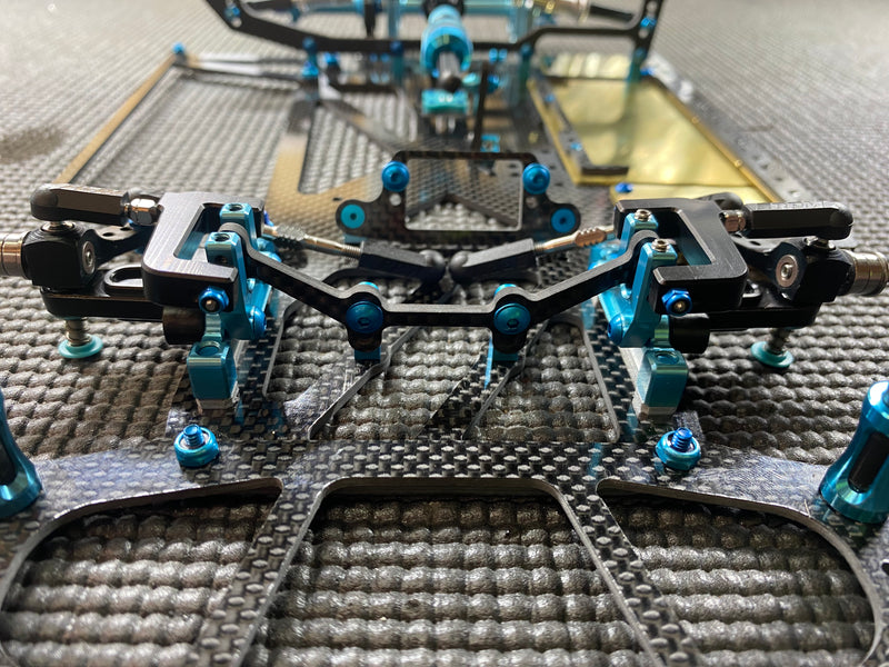 This is the brand new front chassis brace system for the 4.8, launched September 2024. This system is especially useful in reducing chassis flex and preventing the dreaded “dump-over” effect on the right-front corner. Highly recommended for spec foam tire classes on high grip; we have opted to not run it in most rubber tire or modified foam applications to allow for more front end flex. Perfect option to tune your chassis flex to taste, if you will. Minimalistic and lightweight design in mind to keep nose weight to a minimum.
