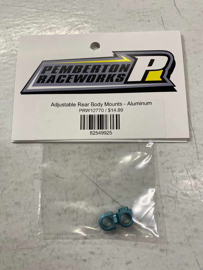 This is a pair of rear adjustable body mounts for your Pemberton Raceworks vehicle. Machined, lightweight aluminum.