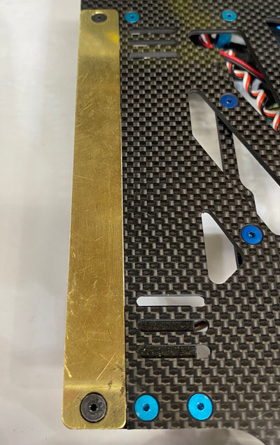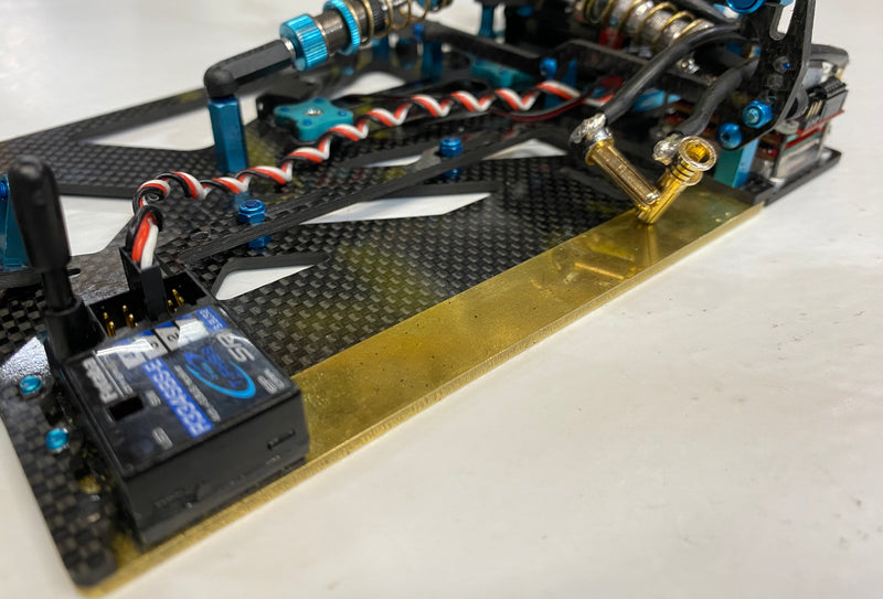 This is a brass left side weight to be used on the Chief-12 1/12 oval pan car kit. Weighing in at 1.6oz, this is how to move weight as far left as possible on the car and also acts as the outside edge of the chassis. Front mounting bracket can be used as a carbon cap to accept a PRW weight (aluminum, brass or tungsten) with the aid of longer screws.