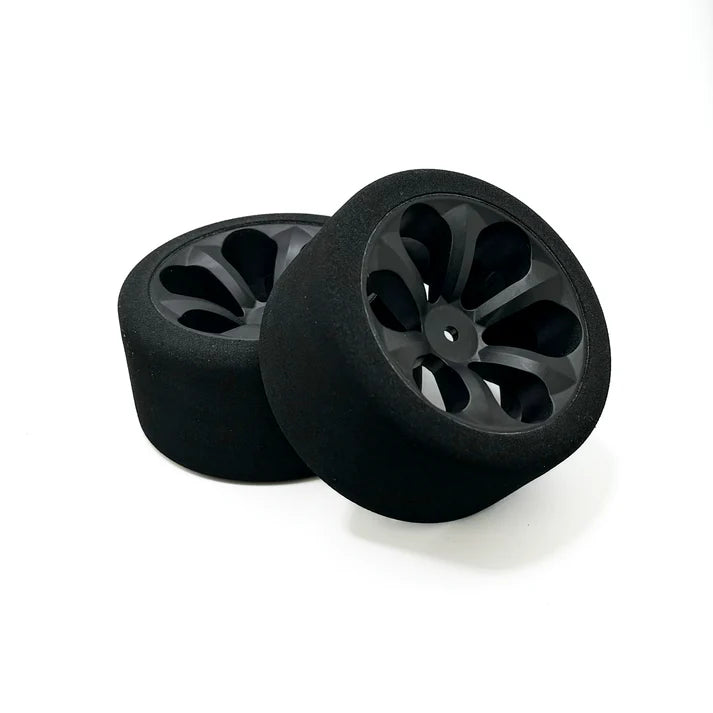 This is a pair of JACO Mudboss tires in purple compound, on black 12mm hex wheels. This is the official spec foam tire for carpet oval Mudboss racing.