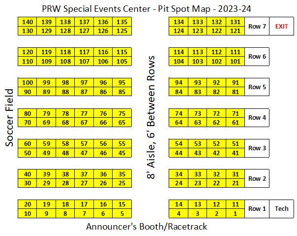 Reserve your pit spot(s) for races at the PRW Special Events Center. "Only 1 Left" means the spot is still available, "Out of Stock" means the spot has already been purchased.