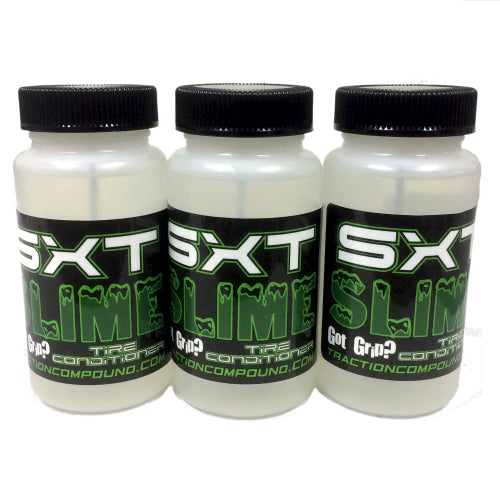 SXT Slime Tire Conditioner was developed to condition foam and rubber tires to feel fresh week to week. Slime can be applied before race day on tires to help prep them for race day, then you can choose your favorite traction compound on the day of racing.